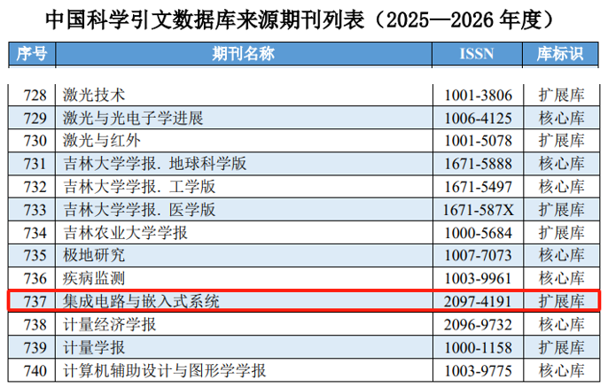2025年8月7日,中国科学院文献情报中心发布了中国科学引文数据库(Chinese Science Citation Database,CSCD)2025—2026年度来源期刊目录,《集成电路与嵌入式系统》创刊18个月即入选CSCD扩展库,标志着期刊的学术影响力得到了业界的认可。